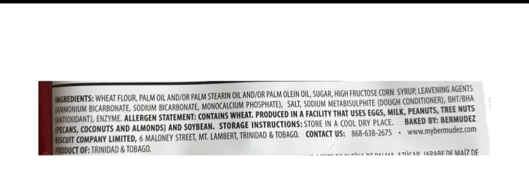 Ingredients: wheat flour, palm oil and/or palm stearin oil and/or palm olein oil, sugar, high fructose corn syrup, leavening agents (ammonium bicarbonate, sodium bicarbonate, monocalcium phosphate), salt, sodium metabisulphite (dough conditioner), bht/bha (antioxidant), enzyme. Allergen statement: contains wheat. Produced in a facility that uses eggs, milk, peanuts, tree nuts (pecans, coconuts and almonds) and soybean. Storage instructions: store in a cool dry place.